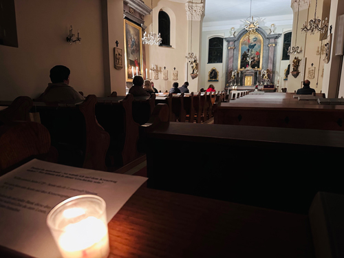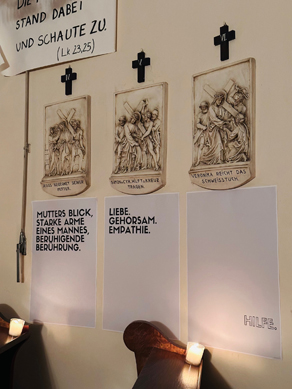 Diesmal standen drei Kreuzwegstationen im Mittelpunkt (Nr. 4, 5 und 6), die alle auf das Themenfeld helfen/mitleiden/dasein ein Schlaglicht werfen. Minimal beleuchtet mit unglaublich tiefsinnigen Worten und wunderbarer Musik war unsere Kirche wieder ein Ort der Stille und Mediation.
