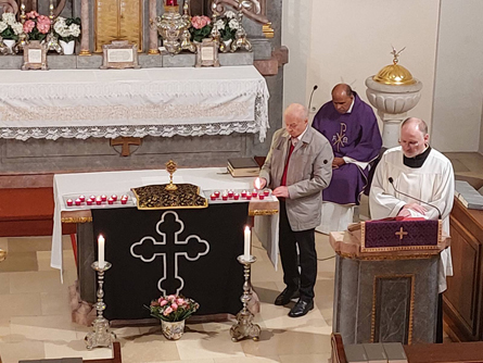 für die im letzten Jahr in der Pfarre Verstorbenen wurden nach der Predigt entzündet. Ein schwarzes Tuch als Zeichen der Trauer mit einem großen