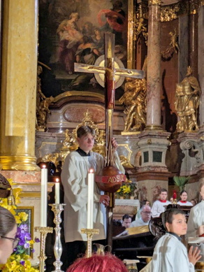 Die ganze Gruppe war sehr stolz, als unsere Großen gefragt wurden, ob sie mit dem Kreuz ganz vorne einziehen würden. Dadurch durften sie auch oben