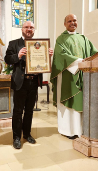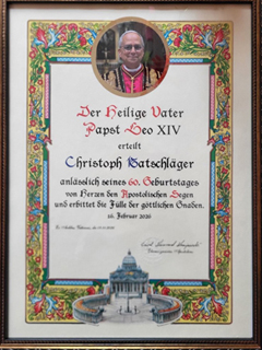 P. Reji überreichte ihm den von Heiligen Vater Papst Leo XIV erteilten APOSTOLISCHEN SEGEN und Oberministrant Thomas Natschläger übergab ihm den von Prälat Anton Höslinger Can.Reg. vom Augustiner Chorherrenstift Klosterneuburg als Zeichen des Dankes und der Anerkennung verliehenen LEOPOLDPFENNIG in SILBER.