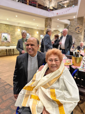 Es war eine besondere Ehre für Pater Reji, zum 90. Geburtstag von Irma Wolff eingeladen zu werden. Er nahm diese Einladung gerne an und betrachtete es geradezu als seine Pflicht, ihr zu gratulieren. Mit persönlichen und herzlichen Glückwünschen überbrachte er auch einen Seidenschal aus seiner Heimat Indien, sowie die besten Grüße der gesamten Pfarrgemeinde.