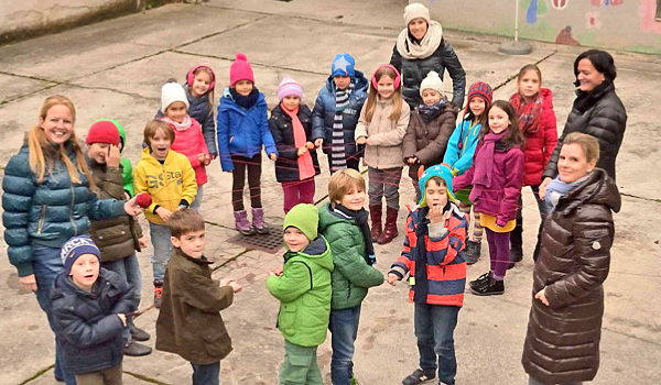 Die Erstkommunionskinder knüpfen ein Freundschaftsnetz im Pfarrhof.
