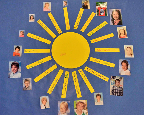 Name und Foto jedes Erstkommunion-Kindes schmücken je einen Sonnenstrahl.