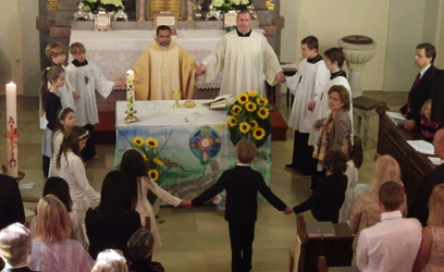Die zweite Messe zelebrierte Michael Hofians, ehemaliger Moderator von Neustift und jetzt Pfarrer in Heiligenstadt, mit 17 Kindern aus der Volksschule Celtesgasse. Zwischen den Gottesdiensten wurde im Pfarrheim und im Pfarrgarten bei herrlichem Wetter gefeiert.