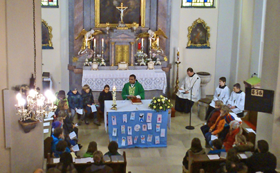 Fast alle der 21 Erstkommunionkinder versammelten sich am Sonntag, dem 26. Jänner, in unserer Kirche. Sie besuchen die Volksschule Celtesgasse, die Volksschule Scheibenberggasse, die Vienna International School und die American International School. Sie werden gemeinsam am „Weißen Sonntag”, dem 27. April, die Heilige Kommunion empfangen.