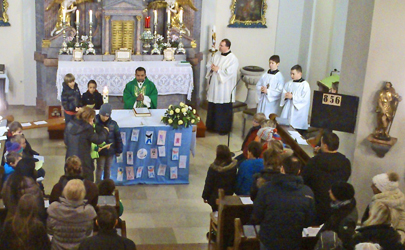 Frau Margit Jachimow, die Leiterin des pfarrlichen Vorbereitungskurses, gestaltete mit den Kindern den Pfarrgottesdienst. Dabei durften sich alle namentlich vorstellen und die Pfarrgemeinde erfuhr dabei auch einiges über ihre Essensvorlieben wie Pizza, Pommes und mehr.