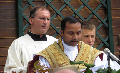 P. Philip hatte Herrn Diakon Dr. Anton Schmid aus St. Martin in Klosterneuburg eingeladen, der ausgehend von der Lebensgeschichte des hl. Rochus in seiner Festpredigt packende Bezüge zur heutigen Zeit herstellte. Eine Premiere war die musikalische Begleitung einer Blasmusikgruppe aus Bratislava, die Haydns Deutscher Messe einen würdigen Rahmen verlieh; berührend auch das zur Kommunion mit der Gitarre begleitete Lied: „In deinem Namen wollen wir, den Weg gemeinsam gehn mit dir” gesungen von Frau Kristin Steyskal.