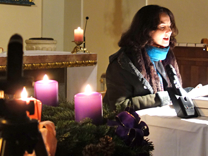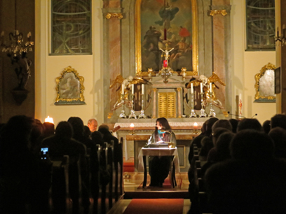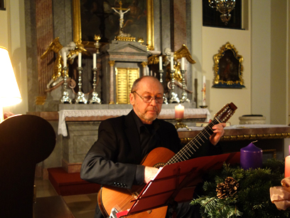 „Als ich die Christtagsfreude holen ging” von Peter Rosegger, gefühlvoll vorgetragen von Mijou Kovacs und virtuos begleitet von Anatol Olschanskiy an der Gitarre – ein weiterer Höhepunkt der Vorweihnachtszeit in unserer Pfarrkirche. Die Textpassagen berührten die zahlreich gekommenen Zuhörer. Das ländliche Idyll eines Waldbauernbuben kann uns zeigen, welch einfache Dinge damals die Leute zu Weihnachten erfreuten, wie zum Beispiel ein gutes Essen: „Fleischbrühe mit Semmelbrocken, Speckfleck, Würste, Nieren-Lümperln, Knödelfleisch mit Kren, dann erst die Krapfen, die Zuckernudeln, das Schmalzkoch mit Weinbeerln und Safran! […] wir haben es im Jahr einmal … ” In unserer Zeit des Überflusses gereicht ein gutes Essen für die Christtagsfreude schon lange nicht mehr. Weiters schrieb Peter Rosegger „… die Luft fing an, fernen Lärm an mein Ohr zu tragen, denn im Tal hämmerten die Eisenwerke, rollte manchmal ein Eisenbahnzug über dröhnende Brücken …” Könnten doch auch wir heute noch den Lärm aus der Ferne vernehmen! Er wird aber zusehends übertönt vom Umgebungslärm. Es wird leider immer lauter in der sogenannten stillsten Zeit im Jahr.