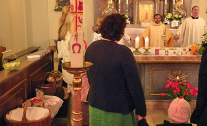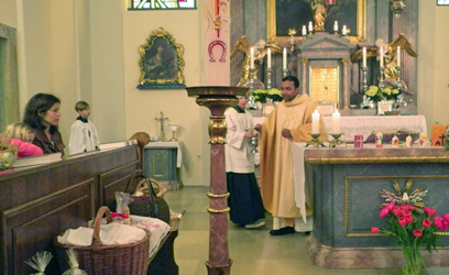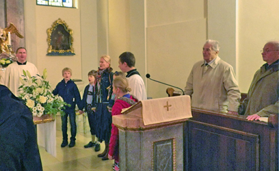 Im Festgottesdienst am Ostersonntag wurden bei der Speisenweihe von Pfarrer Philip die mitgebrachten Osterspeisen geweiht. Für unsere Kleinsten gab es wieder einen von Bettina Schilling gestalteten Wortgottesdienst, ehe die Kinderschar zum Vater Unser in die Kirche einzog. Die Überraschung nach der Hl. Messe war groß. Weil alle so brav waren, hatte der Osterhase im Pfarrgarten mehrere bunte Nester mit Süßigkeiten versteckt, welche von den Kindern eifrig gesucht und rasch gefunden wurden.