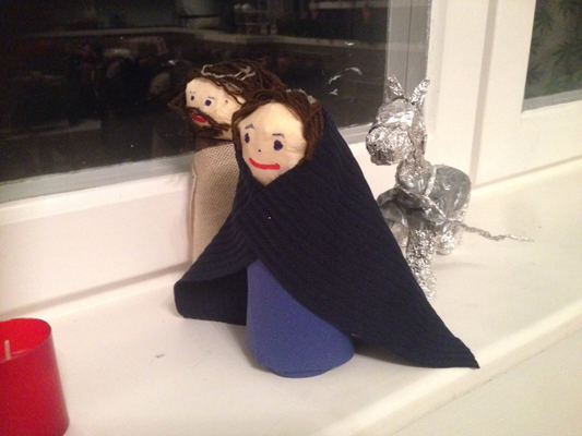 Auch eine eigene Weihnachtskrippe hat die Jungschargruppe gebastelt. Maria und Josef haben sich nun mit ihrem Esel schon auf den Weg gemacht. Zu bewundern sind diese kleinen Kunstwerke am Fensterbrett der Küche im Pfarrheim.