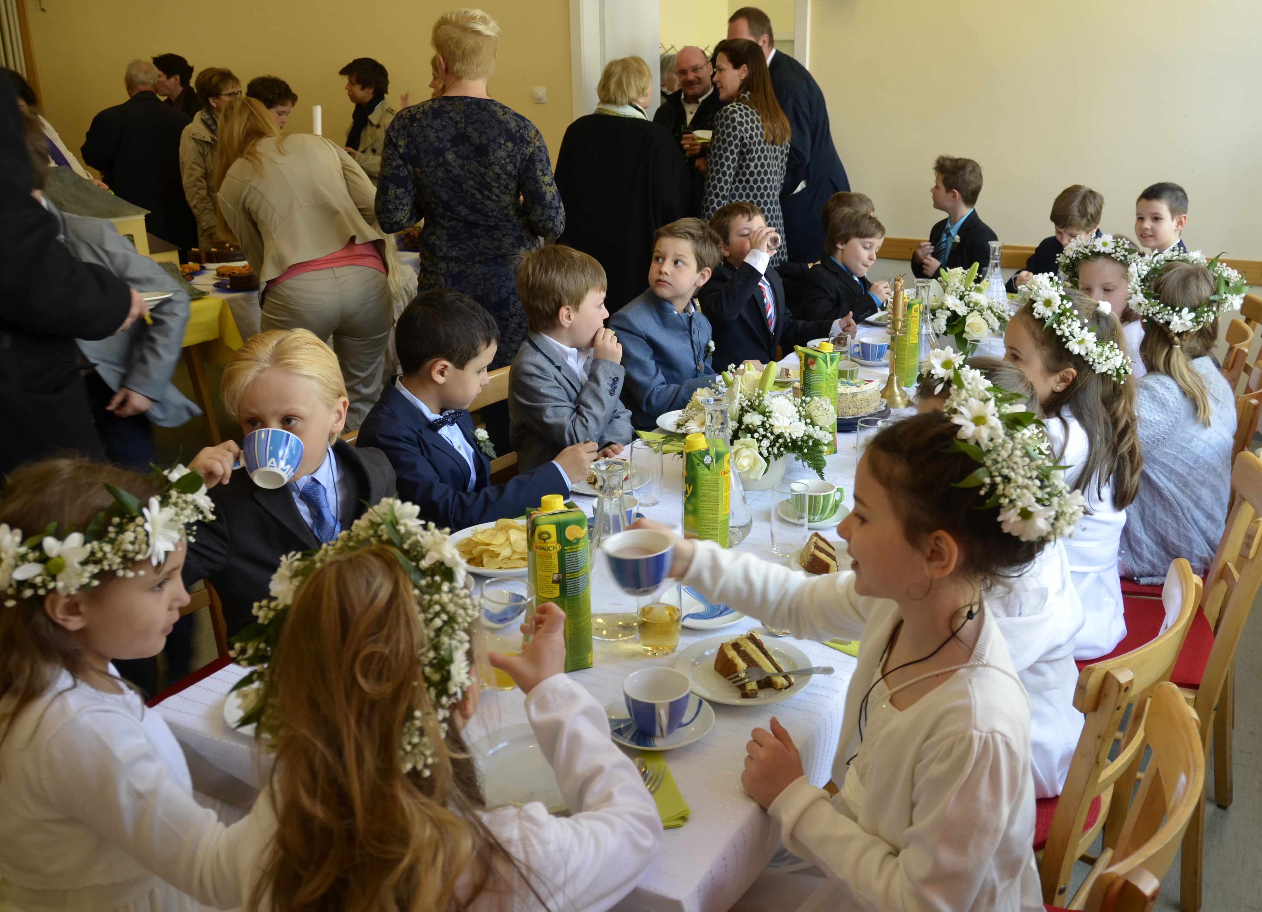 Die Agape lud anschließend die zahlreichen Gäste noch zum Verweilen und Plaudern ein. Ein herzliches Dankeschön nochmals für die großartige Unterstützung von Seiten der Pfarrgemeinde! Auch unsere Erstkommunionskinder jausneten noch ein letztes Mal gemeinsam an ihrer festlichen Tafel mit Kakao und Torte.