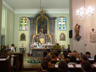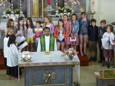 Besonders für die Kinder der vierten Klasse, die während der Kommunion vor dem Hochaltar als Zeichen des Dankes aber auch des bevorstehenden Abschieds von der Volksschule ein gemeinsames Lied sangen, war diese Feier sehr berührend nicht zuletzt deshalb, weil die Religionslehrerin, Frau Andrea Jenny, nach 16 Jahren unsere Volksschule verlässt. Wir alle, besonders die Kinder, schätzen Frau Jenny sehr und wünschen ihr an ihrem neuen Arbeitsplatz alles Liebe und Gute!