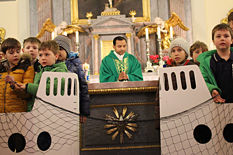 Nach Einstiegsgedanken zum Thema Netz – dem Netz unserer Gemeinschaft – wurde das Evangelium „Jesus ruft seine ersten Jünger” (Lukas 5,1-11) von den Kindern szenisch dargestellt.