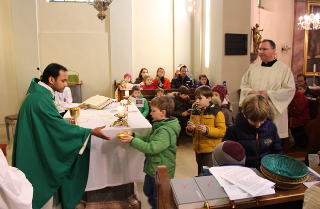Jedes Kind hatte zumindest eine Aufgabe bei dieser Messe übernommen: das Lesen einer Fürbitte, die Mithilfe bei der Gabenbereitung oder das Einsammeln der Spenden. Die musikalische Begleitung mit Orgel und Trompete und die schwungvollen Lieder, auch im Kanon gesungen oder von Bewegungen begleitet, gaben der Messe einen stimmungsvollen Rahmen.