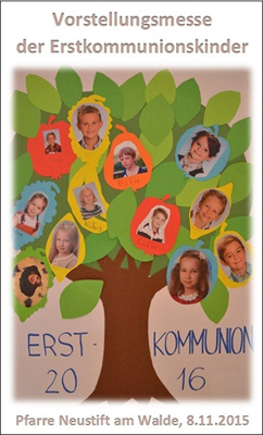 Das Vorstellungsplakat zeigt die Erstkommunionskinder als die vielen Früchte auf Gottes Obstbaum. Am Schluss der Messe nahmen viele Mitglieder der Pfarrgemeinde die Gelegenheit gerne wahr, eines dieser „Früchtchen” zu „ersteigern”, um dieses Kind bis zur Erstkommunionsfeier besonders ins Gebet einzuschließen.