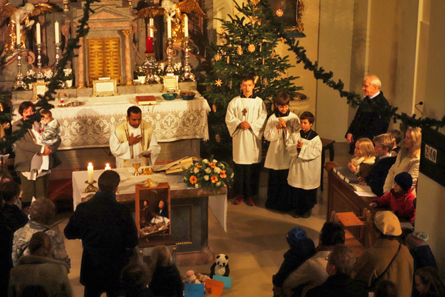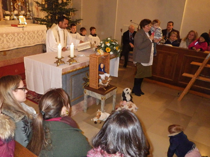 hieß es bei der Kindermette am Nachmittag des Heiligen Abend. Mit über zweihundert Mitfeiernden war unsere kleine Kirche wieder bis auf den letzten Platz gefüllt. Dem Jesukindlein vor dem Altar leisteten nicht wie üblich Ochs und Esel Gesellschaft, sondern die vielen mitgebrachten Lieblingsstofftiere der Kinder. Besinnliche Weisen von einem großartigen Blechbläsertrio und stimmungsvolle Weihnachtslieder mit Gitarre und Cajonbegleitung stimmten auf das bevorstehende Fest ein. Mit geräuschlosen Leuchtraketen, um das Christkind und auch die Nachbarschaft nicht zu erschrecken, wurde anschließend der Weg nach Neustift angezeigt.