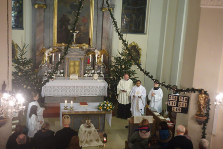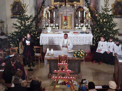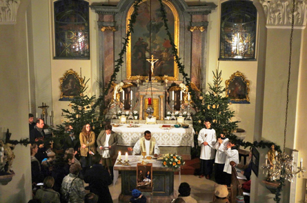 Traditionell begann die Mette zur Einstimmung mit einem allgemeinen Weihnachtssingen. Dann wurde mit einer langjährigen Tradition gebrochen. Die Christmette fand ohne traditionelle Geigenklänge statt. Das stattdessen geplante Blechbläsertrio spielte schon bei der Kindermette am Nachmittag. Daher sprangen die Gebrüder Natschläger kurzerhand als „Neustifter Zweigesang” ein und verliehen so der Messe eine festliche Note. Besonders stimmungsvoll „Stille Nacht heilige Nacht” gesungen bei Kerzenschein am Ende des Gottesdienstes. Zum Glück fielen die nächtlichen Temperaturen annähernd auf winterliches Niveau und der von Familie Ferschel gespendete Glühwein fand nach der Mette großen Anklang.