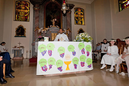 Dem Motto unserer Erstkommunionsvorbereitung „Wir sind die Früchte Gottes” folgend ging es in der Lesung um die beiden Weinstöcke. Auch das Altartuch hatten die Kinder in der Vorbereitungszeit zum Evangelium Johannes 15, 4-5 passend mit Weintrauben verziert. Sehr gefreut haben sich die Kinder über die hölzernen Tau-Kreuze, die sie zur Erinnerung an ihre erste Heilige Kommunion von Pater Philip überreicht bekommen haben. Orgel, Saxophon und Gitarre sowie schwungvolle Lieder begleiteten die Feier. Wie die Omi eines Erstkommunionskindes es so nett ausgedrückt hat: „Dem lieben Gott gefällt es sicher, wenn Kinder in der Kirche so fröhliche Lieder singen!”