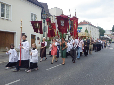 Der Prozessionsweg nahm heuer einen neuen Weg. Er führte vorbei am Neustifter Spitz, das Fuhrgassl hinauf zur Mariensäule und dieses wieder zurück über die Rathstraße zur Eyblergasse, wo erstmals beim Pfarrhof ein Altar aufgebaut war. Dort erhielten unsere Ministrantinnen und Ministranten neue Umhängekreuze. Diese sind als Wendekreuze ausgeführt und zeigen auf der einen Seite Christus am Kreuz, auf der anderen Maria vor dem Kreuz. Begleitet wurde die Prozession traditionell von der Stadtkapelle Schwechat.