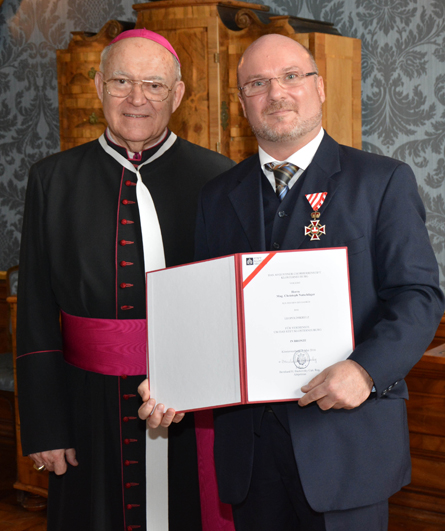 Die Anerkennung der Pfarrgemeinde hatte Mag. Christoph Natschläger schon seit langem. Am 3. Mai 2016 wurde er auch offiziell ausgezeichnet. Propst Bernhard Backovsky verlieh ihm in feierlichem Rahmen das „Leopoldskreuz in Bronze des Chorherrnstiftes Klosterneuburg“. In seiner Ansprache würdigte Probst Backovsky das jahrelange Engagement von Mag. Christoph Natschläger für die Pfarre Neustift, der mit seinen vielfältigen Tätigkeiten einen wichtigen Beitrag für ein lebendiges Pfarrleben leistet.