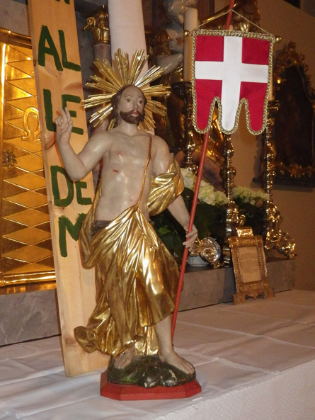 Statue des Auferstandenen mit neuer Fahne vor dem Hochaltar |