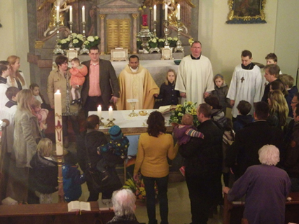 Nach dem Einzug versammeln sich die Kinder zum Vater unser um den Altar | Ostereier, die gesegnet und nach den Messen traditionell beim Kirchentor verteilt werden |