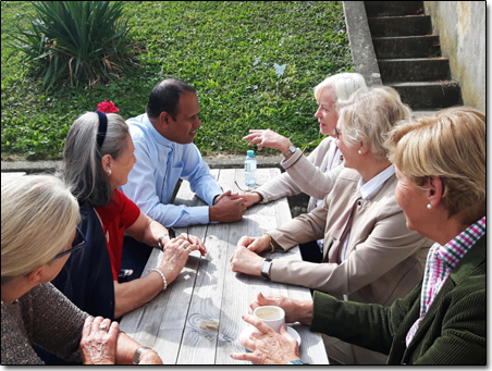 Interessantes für Klein und GroßTischrunde beim Gespräch mit Pater RejiGleich wird geschmökert