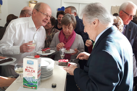 Genau an diesem Tag feierte auch Mag. Heinz Natschläger seinen 80. Geburtstag. Schon die Messe wurde musikalisch mit Orgel und Violine besonders gestaltet und beim anschließenden Pfarrkaffee durfte ein Glaserl Sekt auf das Wohl des "Geburtstagskindes" selbstverständlich nicht fehlen, ebenso wenig wie die extra für diesen Anlass gebackene ausgezeichnete Mohntorte. Heinz ist seit vielen Jahren in unserer Pfarre fest verwurzelt und bringt sich in den unterschiedlichsten Bereichen ein, wie etwa als Lektor. Sein Hauptbetätigungsfeld stellt aber ohne Zweifel das Katholische Bildungswerk dar, das er seit nunmehr beinahe 25 Jahren so erfolgreich und mit viel Einsatz leitet.