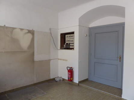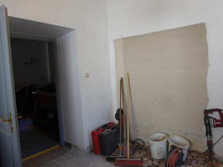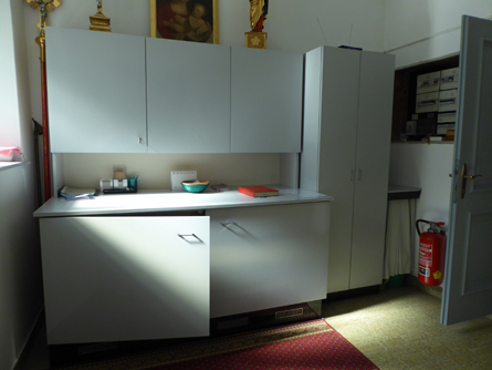 Bei der umfassenden Kirchenrenovierung unter Pfarrer Schüch 1978, wurde unter anderem der Altarraum um eine Stufe angehoben, um eine bessere Sicht auf den Zelebranten zu ermöglichen. Leider verabsäumte man es damals, auch den Boden der Sakristei anzuheben, sodass gleich nach der Türe eine Stufe entstand, die sich immer wieder als gefährliche Stolperfalle entpuppte. Um diesen Missstand zu beseitigen, bestand schon lange der Wunsch, den Fußboden der Sakristei auf das Niveau der Kirche anzuheben, was zusätzlich den Vorteil mit sich bringt, dass damit der Zugang zur Kirche über die Sakristei fast barrierefrei erfolgen kann. Im Zuge der Arbeiten wurde der unschöne Fußboden entfernt, ein neuer Estrich gelegt und eine Fliesenheizung eingebaut, die den bestehenden Nachtspeicherofen ersetzen wird. Der neue Fußboden aus Solnhofener Platten entspricht dem der Kirche und wird so ein einheitliches optisches Bild ergeben. Da die Einrichtung der Sakristei aus den frühen 60er Jahren des 20. Jahrhunderts schon mehr als in die Jahre gekommen und mehrfach umgebaut worden war, ist auch an die Anschaffung neuer Möbel gedacht, die in Ausführung und Design dem Raum absolut gerecht werden und sich dem Stil der Kirche anpassen.