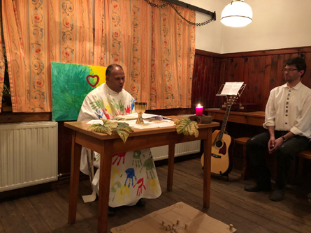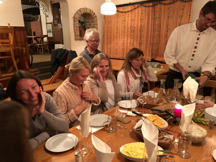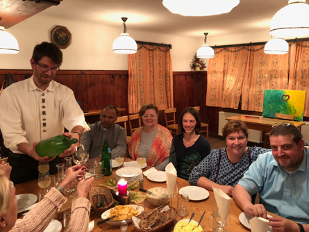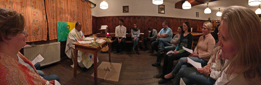 -Treffen fand in Erich Ferschels Heurigen „Schiefer Giebel” statt. Am Programm standen eine Kellerführung und eine besondere Messe mit anschließendem gemütlichen Beisammensein. Die Kellerführung musste leider auf Grund eines unerwarteten Ereignisses auf einen späteren Termin verschoben werden. Für die besondere Messe hatten Pater Reji und Bettina als Evangelium „Das Gleichnis von den Arbeitern im Weinberg (Matthäus 20, 1-16)” ausgewählt, zu dem es verschiedene Gedankenexperimente gab, die zu angeregten Diskussionen führten. Anschließend wurden beim gemütlichen Beisammensein noch ein „Staubiger” und Wein mit frischem Brot und Aufstrichen verkostet. Vielen Dank an Erichs Mama Martha, die uns trotz der Umstände diesen sehr netten und unterhaltsamen Abend ermöglicht hat!