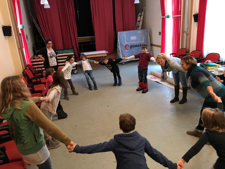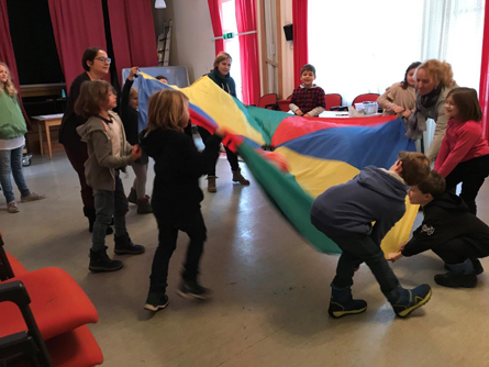 versuchten gemeinsam einen Ball auf einem Sprungtuch zu bewegen. In einem
