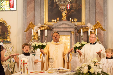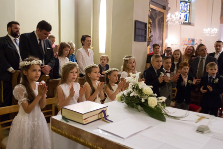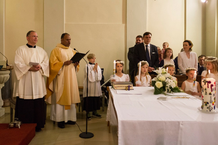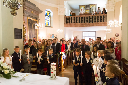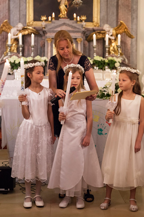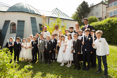 17 Kinder empfingen in einer wunderschönen Feier das erste Mal die heilige Kommunion. Ganz nach dem Motto unserer Erstkommunionsvorbereitung „Du bist ein Ton in Gottes Melodie” sangen die Kinder in der Messe begeistert „ihre” Lieder. Ganz besonders zeichnete diese Feier auch die vielfältige musikalische Begleitung aus – vielen Dank an die Musikerinnen und Musiker Helene (Geige), Gabriel und Prisca (Oboe), Christoph (Orgel) und Gregori (Gitarre).