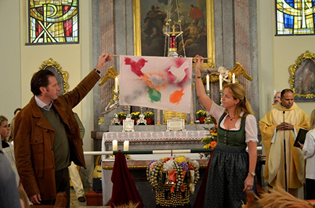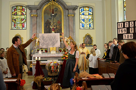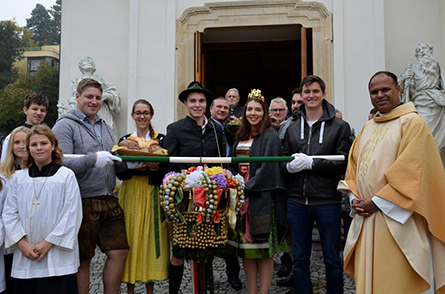Die Neustifter Winzer kamen traditionell mit ihrer 265 Jahre alten Hauerkrone und die Messfeier bot einige kreative Gestaltungselemente. Das Evangelium, welches mit Bildern veranschaulicht wurde, erzählte das Gleichnis vom Sämann. Die Predigt in Form einer Art Doppelconférence zeigte auf, dass beim Evangelium durchaus auch nachgefragt und auch hinterfragt werden darf. Im Dialog wurde herausgearbeitet, was für ein gelungenes Lebens notwendig ist. Nicht zu kurz kam auch die aktuelle Klimaproblematik. Selbst wenn der Genuss von exotischen Früchten einen kulinarischen Hochgenuss darstellt, so sollte man dabei nie vergessen, dass die weiten Transportwege nicht sehr umweltfreundlich sind.