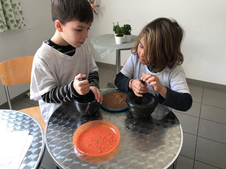 Die EK-Kinder machen Getreide selbst zu Mehl