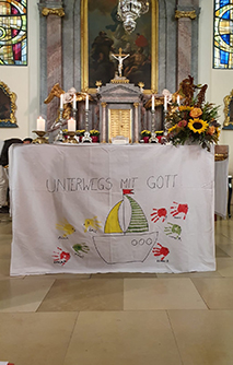 Die Messe zeigte, dass die Erstkommunionmannschaft schon ein gutes Team geworden war. Zwei Miniszenen verdeutlichten im Bußakt, was auf einer gemeinsamen Schifffahrt daneben gehen kann. Die Buben wurden dann in einem Lied vorgestellt und als Gebetserinnerung gab es eine Flaschenpost von jedem Buben. Schwungvolle Lieder rundeten die Messe ab. Die anschließende Agape wurde von den Eltern der Burschen bereitgestellt. Danke für die Organisation an Dani und Tanja.