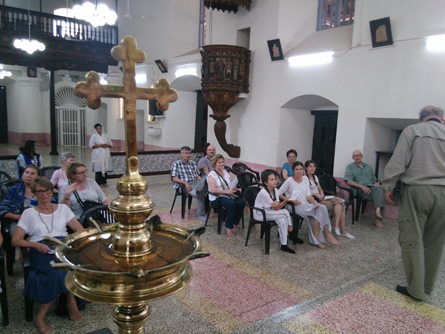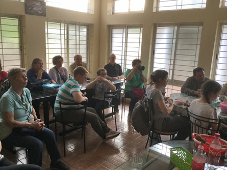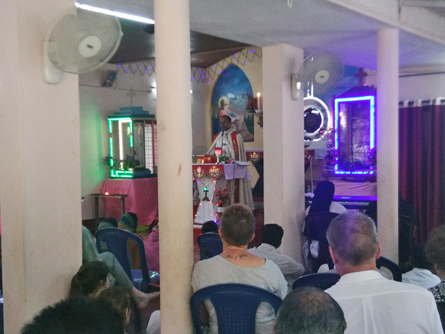 Nicht weniger beeindruckend war der Besuch in Thalippara, einem kleinen Bergdorf im Bezirk Kannur/Kerala, dem Geburtsort von Pater Reji. Der Gruppe wurde ein herzlicher Empfang bereitet und Rejis Mutter verwöhnte mit reichlich schmackhaften indischen Köstlichkeiten. Fast die ganze Familie war versammelt um alle zu umsorgen. Gestärkt ging es danach zur Sonntagsmesse in die kleine Pfarrkirche von Udayagiri, in welcher es nicht zuletzt wegen der Gäste aus Neustift eng wurde. Pater Reji zelebrierte im syro-malabarischen Ritus. Vor allem die Musik war es, die begeisterte. Meditative Klänge und erfrische rhythmische Gesänge ließen diesen Gottesdienst zu einem wohl gut in Erinnerung bleibenden Erlebnis werden.