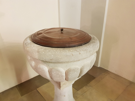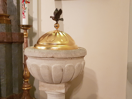Genauen BeobachterInnen wird wohl das leere Tischchen vor dem Volksaltar aufgefallen sein. Gleich nach der Kommunion löste Brigitte Trinkl dieses Geheimnis und erklärte, dass es für den neuen Deckel des Taufbeckens gedacht ist, dessen feierliche Einweihung P. Reji nun vornehmen werde. Er wurde aus den Erträgen des Flohmarktes finanziert, womit man für die Pfarre etwas Bleibendes und für alle Sichtbares schaffen wollte. Der neue Deckel nimmt die Form des Taufbeckens auf, ist von einem die Weltkugel symbolisierendem Knauf und darüber mit der Taube des Heiligen Geistes aus Bronze bekrönt. Insbesonders das Finden eines passenden Models für die Heilig-Geist-Taube zum Abguss bereitete beträchtliche Schwierigkeiten, bestand doch von Beginn an der Wunsch nach einer vollplastischen Darstellung.