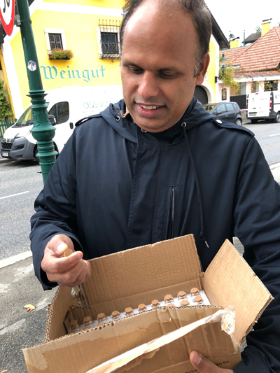 Pater Muthukattil Reji beim Unboxing - oder altmodisch: Auspacken - der Weihwasserfläschchen für unser Allerseelenangebot.