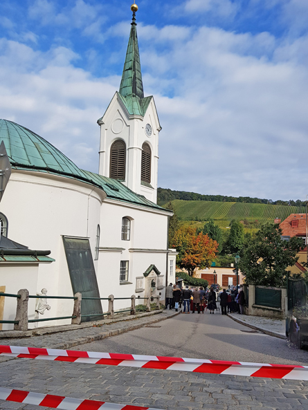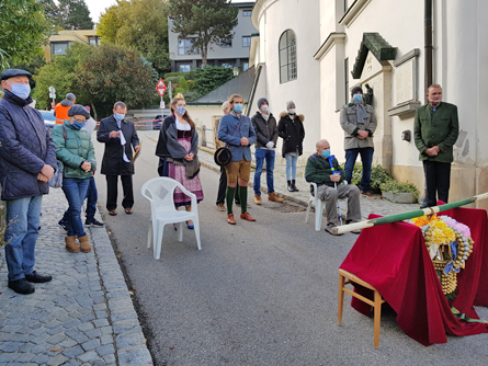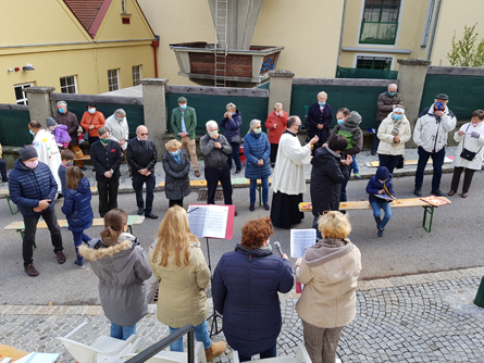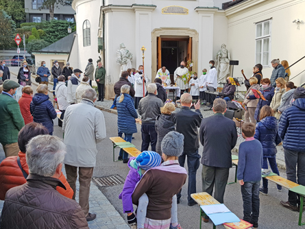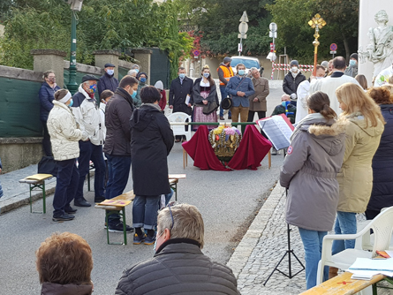 Erstmals fand eine Messfeier in der Eyblergasse statt. Um einen ausreichenden Sicherheitsabstand einhalten zu können, entschied man sich vor und nicht in der Kirche zu feiern. Es war zwar etwas kühl, dies tat aber der Festlichkeit keinen Abbruch.