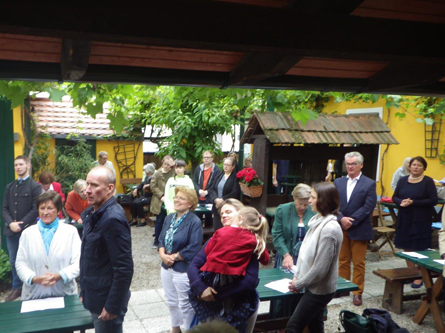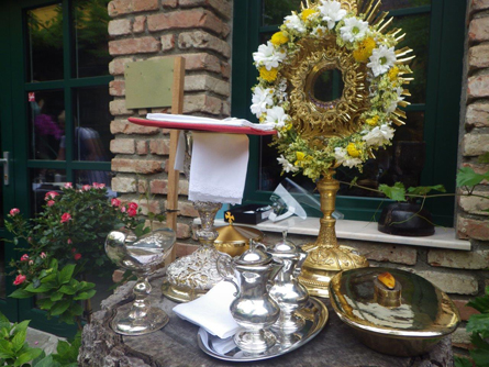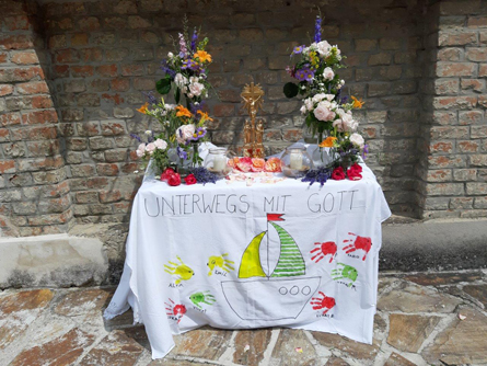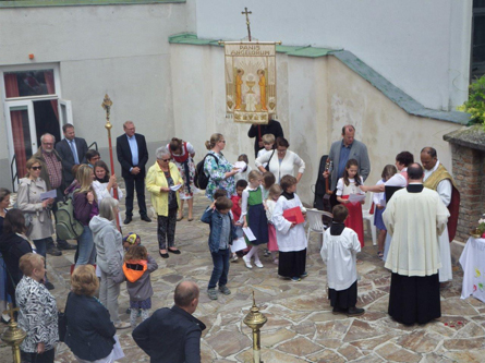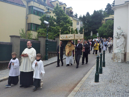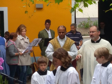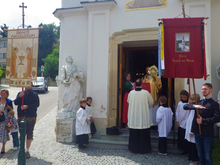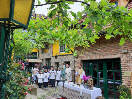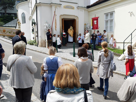 Auch der Prozessionsweg war neu. Es begann mit einer Feldmesse im Rosenhof von Weingut und Buschenschank Wolff, welchen die Hauerfamilie dankenswert zur Verfügung stellte und dort einen liebevoll geschmückt Altar aufbaute. Die musikalische Gestaltung übernahm das bewährte Team der Familienmessen und die Liedauswahl bot für jeden Musikgeschmack etwas. Bemerkenswert auch die Altersstruktur der Mitfeiernden, von ganz jung bis ins fortgeschrittene Alter, alles war vertreten. Es war ein Fest der gesamten Pfarrfamilie. Das erste nach längerer Zeit, waren doch die geforderten Sicherheitsbestimmungen in den letzten Monaten sehr einschränkend. Die Prozession führte anschließend über die Rathstraße und Neustift am Walde in den Hof des Pfarrhofes in der Eyblergasse. Dort durften sich speziell unsere Jüngsten bei einem eigens für sie gestalteten Kinderaltar mit von ihnen vorgetragenen Texten in die Feierlichkeiten einbringen. Der abschließende Einzug in die Kirche unterblieb wegen der derzeit geltenden Sicherheitsbestimmungen. Und so wurde diesmal der Schlusssegen vor der Kirche gespendet und auch das traditionelle Abschlusslied „Großer Gott wir loben dich” wurde dort angestimmt, zu den durch das geöffnete Kirchentor dringenden Orgelklängen.