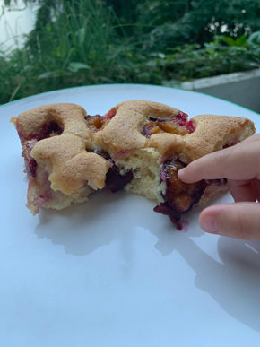 Anschließend 42dag Mehl und ¹⁄₂ Packerl Backpulver hinzufügen, den Eischnee der sechs Eier unterheben und in eine Auflaufform (Backpapier!) geben. Dann mit Zwetschgen belegt im Rohr (Ober- und Unterhitze) bei 180 Grad goldbraun backen (mit einer Gabel testen ob der Kuchen durch ist).