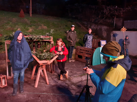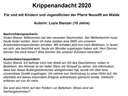 Es ist ein Stück über die Geburt eines Kindes, gespielt von Kindern, für Kinder und - ganz besonders hervorzuheben – auch geschrieben von einem Kind. Der Text entstammt der Feder der erst zehnjährigen Luzia, die mit viel Kreativität und etwas Fantasie die Geburt Christi in die heutige Zeit verlegt hat. Ein Auslandskorrespondent wird vom Schauplatz des Geschehens, einem Stall im fernen Bethlehem, zugeschaltet und eine Nachrichtensprecherin, gespielt von der jungen Autorin höchstpersönlich, berichtet von diesem welthistorischen Ereignis. Matthias schlüpft in die Rolle des Josef, Feli in jene von Maria und Gabriel spielt, wie könnte es auch anders sein, die Rolle des Erzengels Gabriel. Festgehalten wird dies alles von Kameramann Felix.