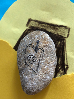 Wer möchte, kann einen Stein gestalten und mit einem Hoffnungsbild - hier ein Herz mit einem Smiley - bemalen.