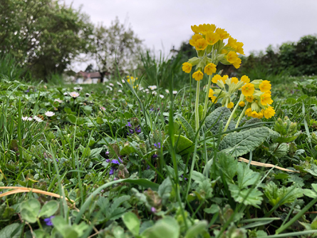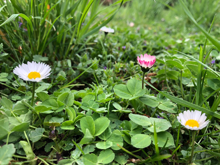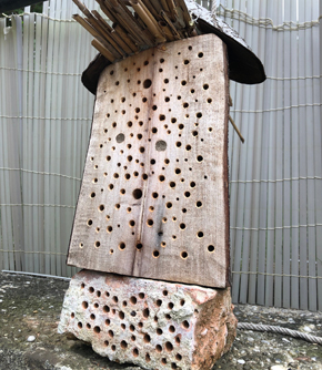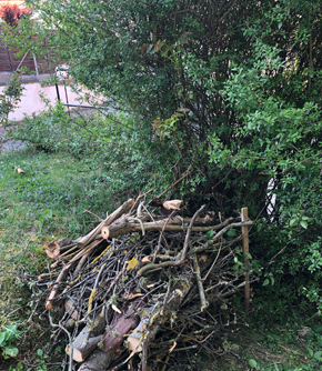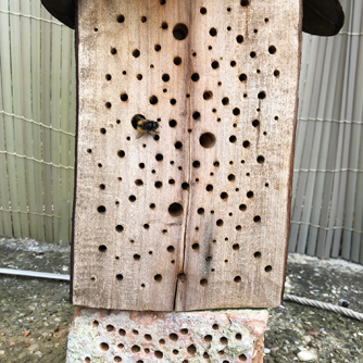 Unsere Wiese darf wachsen, blühen und Heimat für Insekten und Vögel werden. Seit Neuestem gibt es bei uns auch eine Totholzhecke, die Unterschlupf für viele verschiedene Tiere bietet. Das Bienenhotel ist endlich bezogen und stark frequentiert.