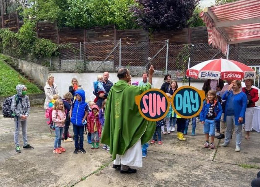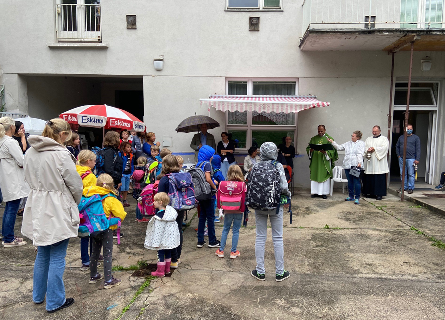 viele Kinder, gefühlt - zu viel Wasser von oben und viel gute Laune - aber unsere Kindergartenrucksack - und Schultaschensegnung im Hof unseres Pfarrheims war trotzdem schön. 35 Kinder mit Eltern, Großeltern und Co. haben sich trotz widriger Wetterlage nicht abschrecken lassen. Das Arbeitsjahr kann beginnen.