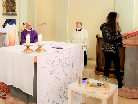 Firmkandidaten und Firmkandidatinnen an der Messgestaltung Provinzial Roberto Pirastu vom