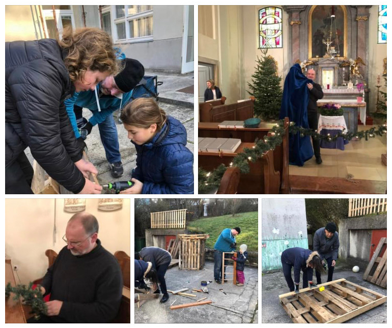 Heute wurde im Pfarrheimhof für die Krippenandacht gewerkelt was das Material hergab und die Kirche wurde ebenfalls aufgehübscht.