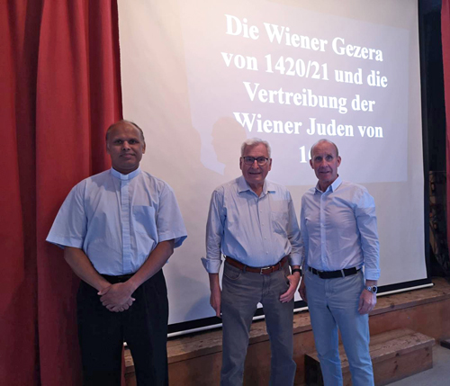 Der Vortragende Oskar Kostelnik brachte dem zahlreich erschienenen Publikum diese finstere Epoche sehr drastisch näher. Fazit der Vertreibung: Sündenböcke, Neid auf die wirtschaftlichen Erfolge, Geldbeschaffung ... somit war das Urteil über die jüdische Bevölkerung im späteren Hochmittelalter in Wien gefallen, entweder Zwangstaufung, Ermordung, oder Vertreibung.
