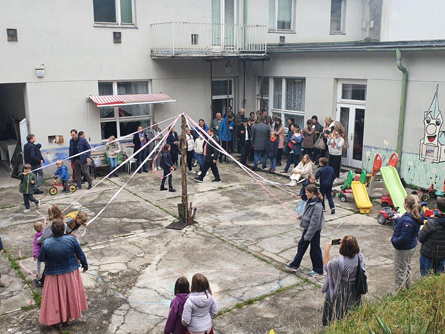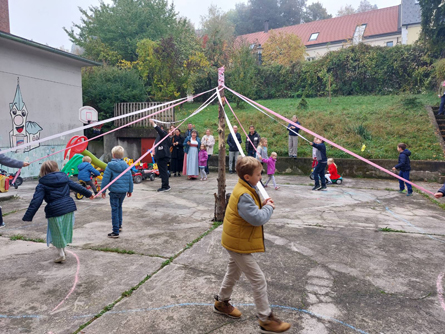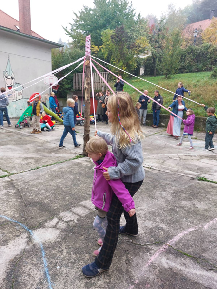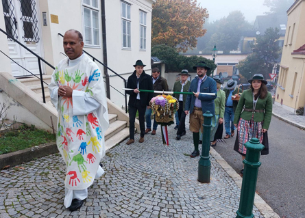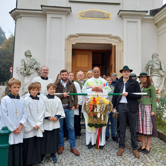 die Neustifter Winzer mit ihrer Hauerkrone und eine von ihnen dankenswerterweise bereitgestellte Agape, sowie ein Bandltanz der Kinder um den Hiatabaum des vergangenen Jahres.