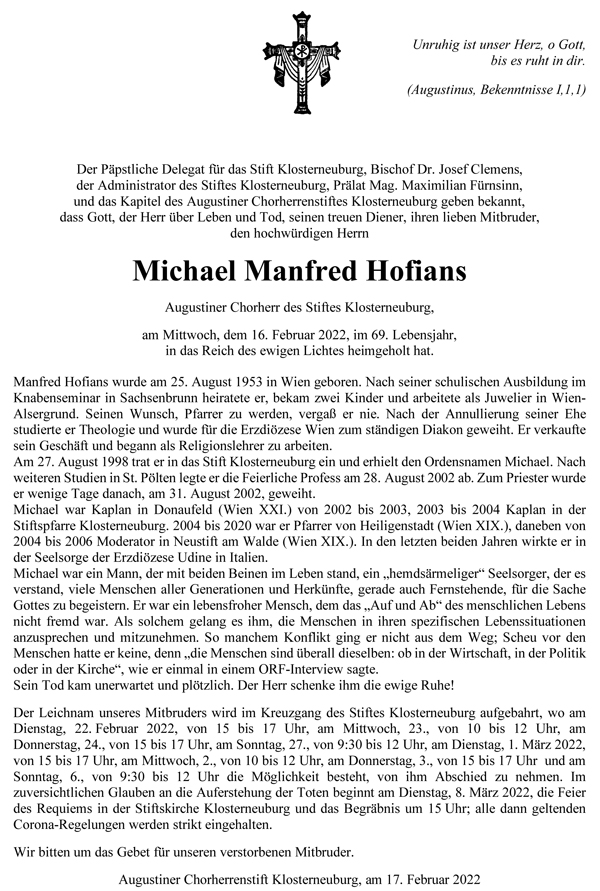 Am 16. Februar 2022 hat Gott unser Herr seinen Diener Michael im 69. Lebensjahr zu sich berufen.